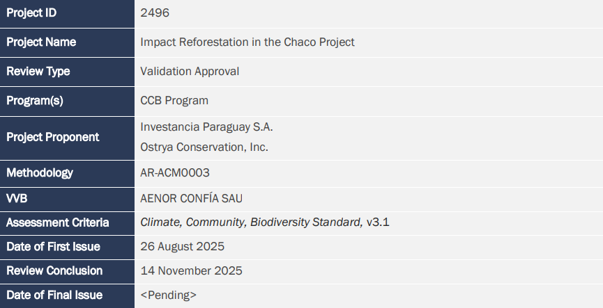 “La validación CCB del «Proyecto Reforestación de Impacto en el Chaco» es un logro significativo y un testimonio de años de trabajo dedicado por parte de Investancia y Ostrya Conservation. El Chaco es una de las regiones ecológicamente más importantes y amenazadas del mundo, y este hito demuestra que la reforestación a gran escala es posible en esta zona. La aprobación bajo el estándar CCB refuerza el papel de la región en la agenda global sobre clima y biodiversidad, y destaca lo que las alianzas comprometidas pueden lograr.”